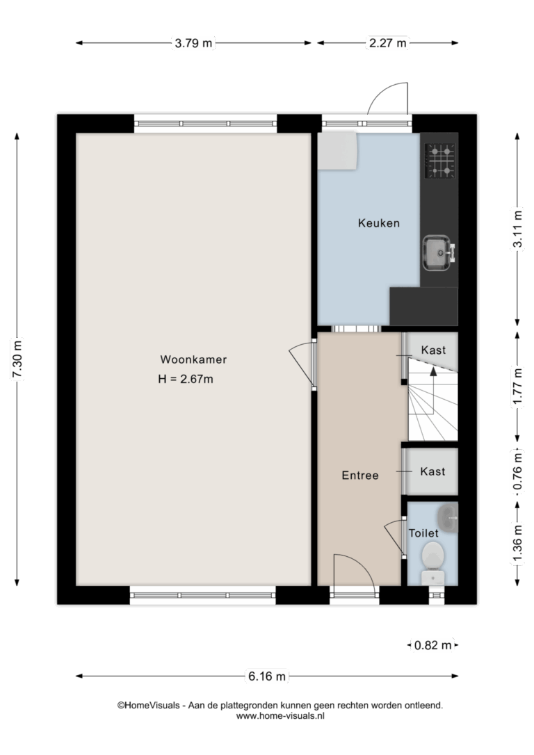 Begane grond: hal - toilet met fontein - straatgerichte woonkamer - dichte keuken voorzien van 5-pits gasfornuis.