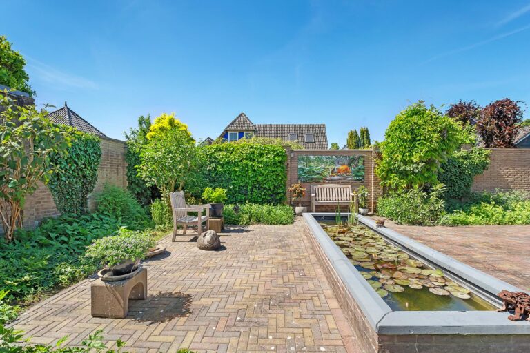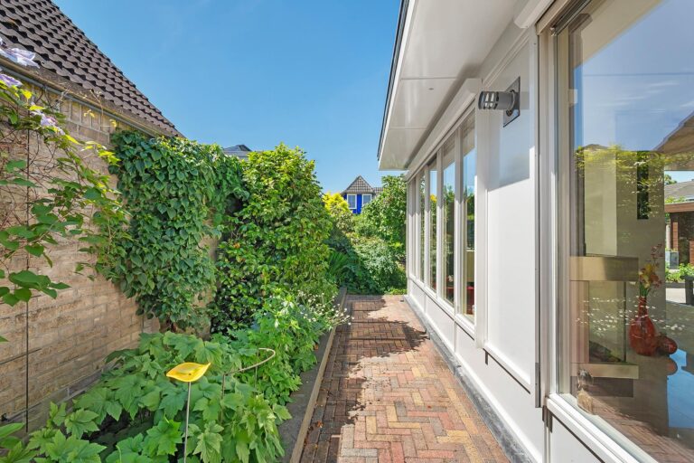 De vrijstaande woning heeft een fraaie tuin rondom met de achtertuin gelegen op het westen. Dankzij de vele raampartijen is de ruime woonkamer met serre bijzonder licht en zonnig.