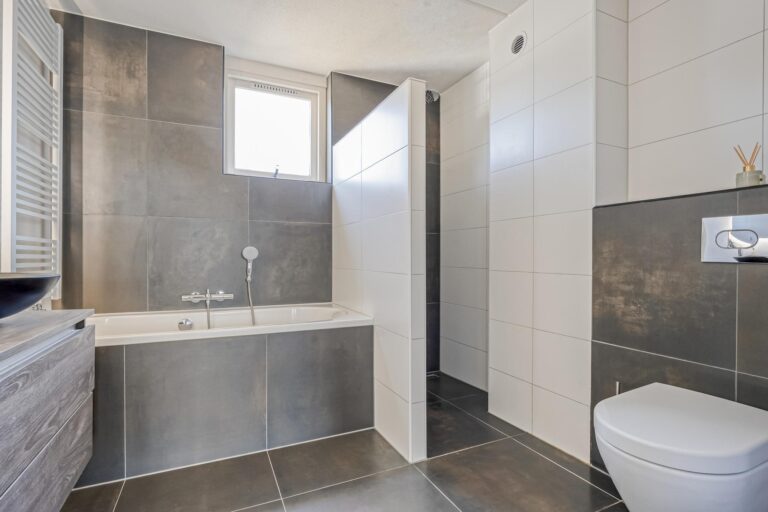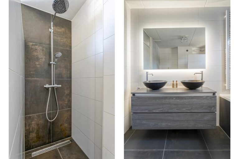 Eerste verdieping: overloop - 3 slaapkamers - moderne badkamer voorzien van ligbad, douche, toilet en wastafelmeubel.