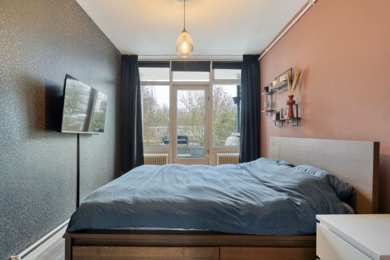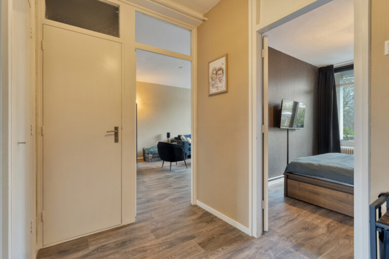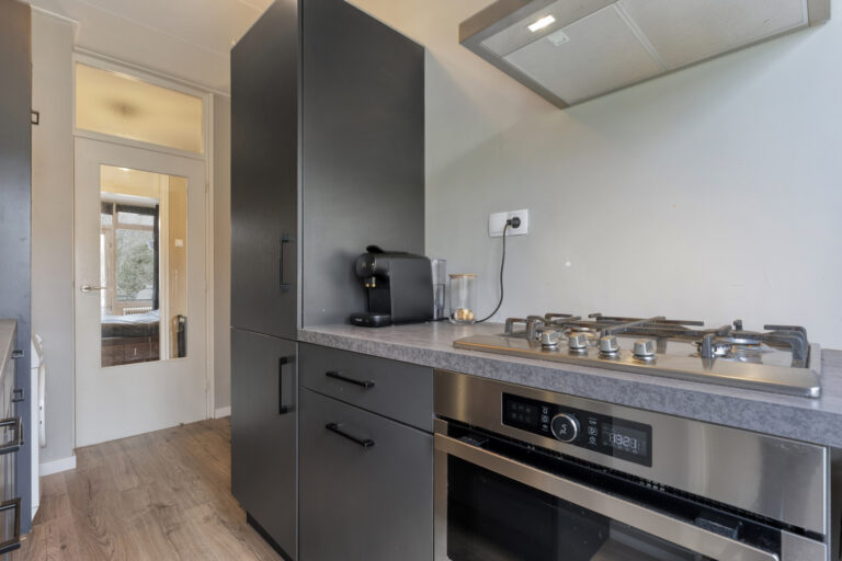 De moderne keuken is strak uitgevoerd en biedt volop werk- en bergruimte. De woonkamer vormt een fijne leefruimte met vrij uitzicht over het groen. Het appartement beschikt over twee slaapkamers, wat het geheel geschikt maakt voor starters, stellen of een klein huishouden.